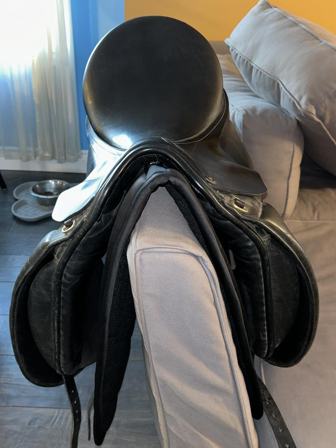 19" wide tree dressage saddle by maker DM. Age unknown, but in good condition. It was re-flocked in 2023, was lightly used, was set aside in early 2024 due to a new horse, and has been indoors since then. $1800 or best offer. Contact Karen Usher at 517-896-8601.